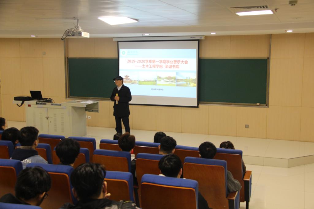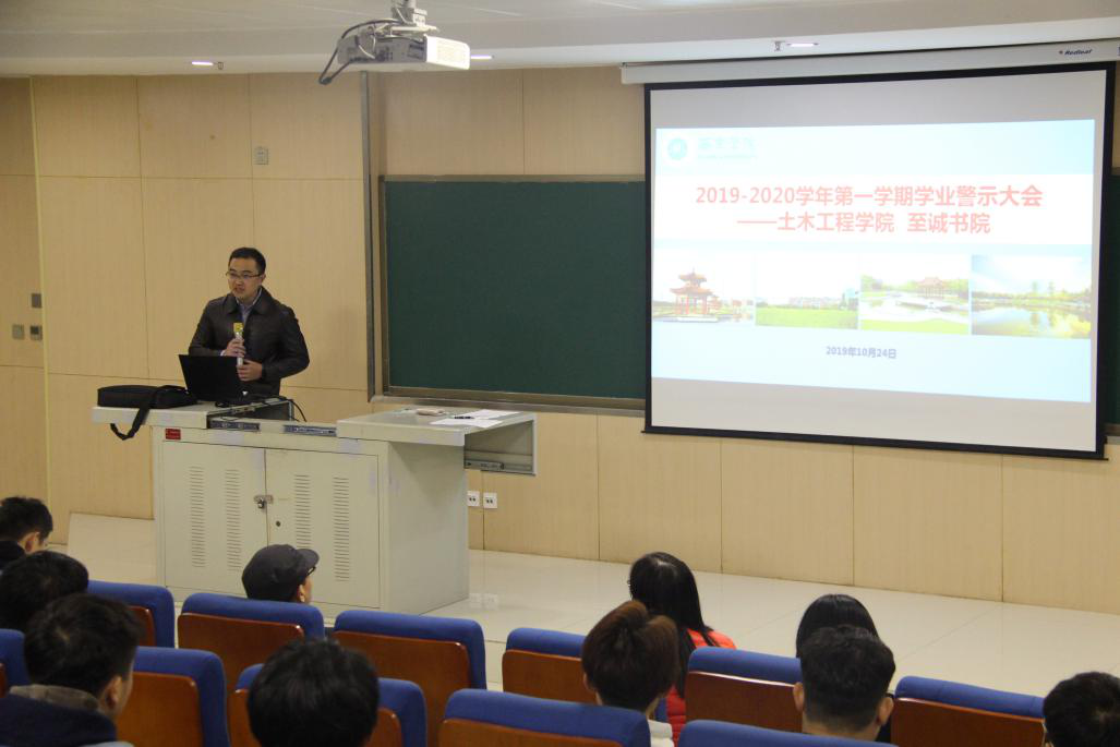 为进一步宣传学业警示制度,使学生了解并遵守这项制度,24日下午,yL23411永利官网登录联合至诚书院在图书馆103报告厅举行2019-2020学年第一学期学业警示教育大会。yL23411永利官网登录院长傅少君、副院长谢明、院长助理权娟娟,至诚书院发展科科长惠媛和至诚书院辅导员和受学业警示的所有学生共67人参加本次大会。会议由yL23411永利官网登录谢明副院长主持。