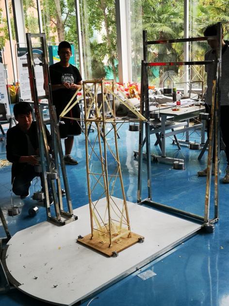本次竞赛命题为“山地输电塔模型设计与制作”,比赛分为理论方案初选、现场制作(模型制作、理论答辩、模型安装和模型加载)两个部分,其中现场模型制作时间累计长达19小时,通过理论方案初选共有6只队伍进入现场,其参赛队伍分别来自行健书院和至诚书院。理论答辩阶段场面激烈,各参赛队伍对参赛作品进行详细介绍,各评委积极反馈,师生讨论融洽。