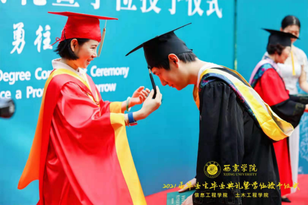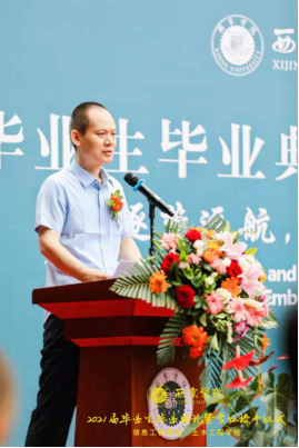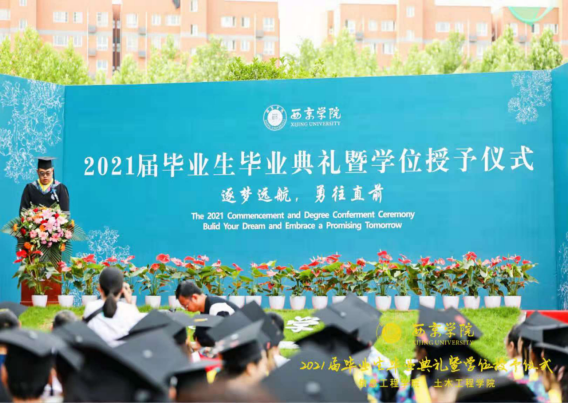 辅导员代表王宁老师发言,他说大学是一场不失约的相遇,毕业是一个崭新的开始。希望同学们以敢想、敢做、敢闯、敢拼的勇气,去享受追求梦想的过程,以梦为马,不负韶华,去续写西京人“挑战极限,追求卓越”的动人故事,去唱响属于他们自己的青春赞歌。