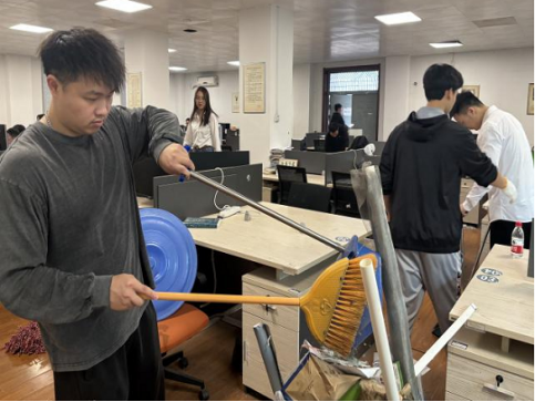 随后,全体成员投入到劳动实践中。大家分工合作,共同打扫自修室和党员活动室卫生,将两个场地打扫得焕然一新,展现了党员的先锋模范作用。